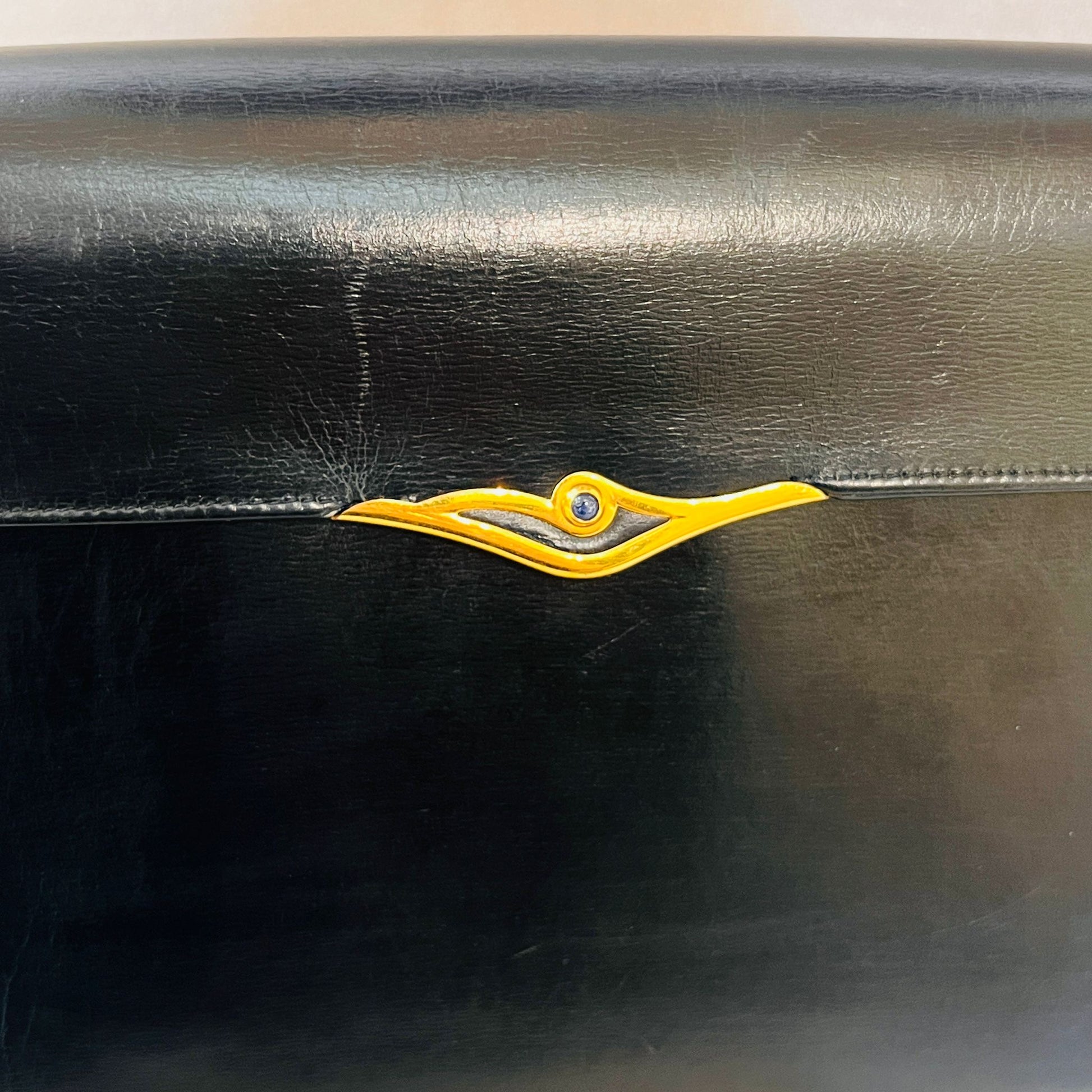 This Cartier Sapphire Line shoulder bag embodies elegance in black leather with a signature gold-tone clasp. Its structured flap silhouette exudes timeless refinement, while the adjustable strap offers versatility for day-to-evening wear.
