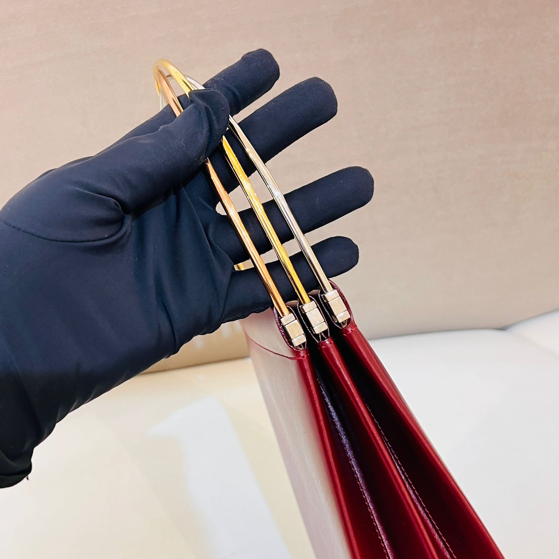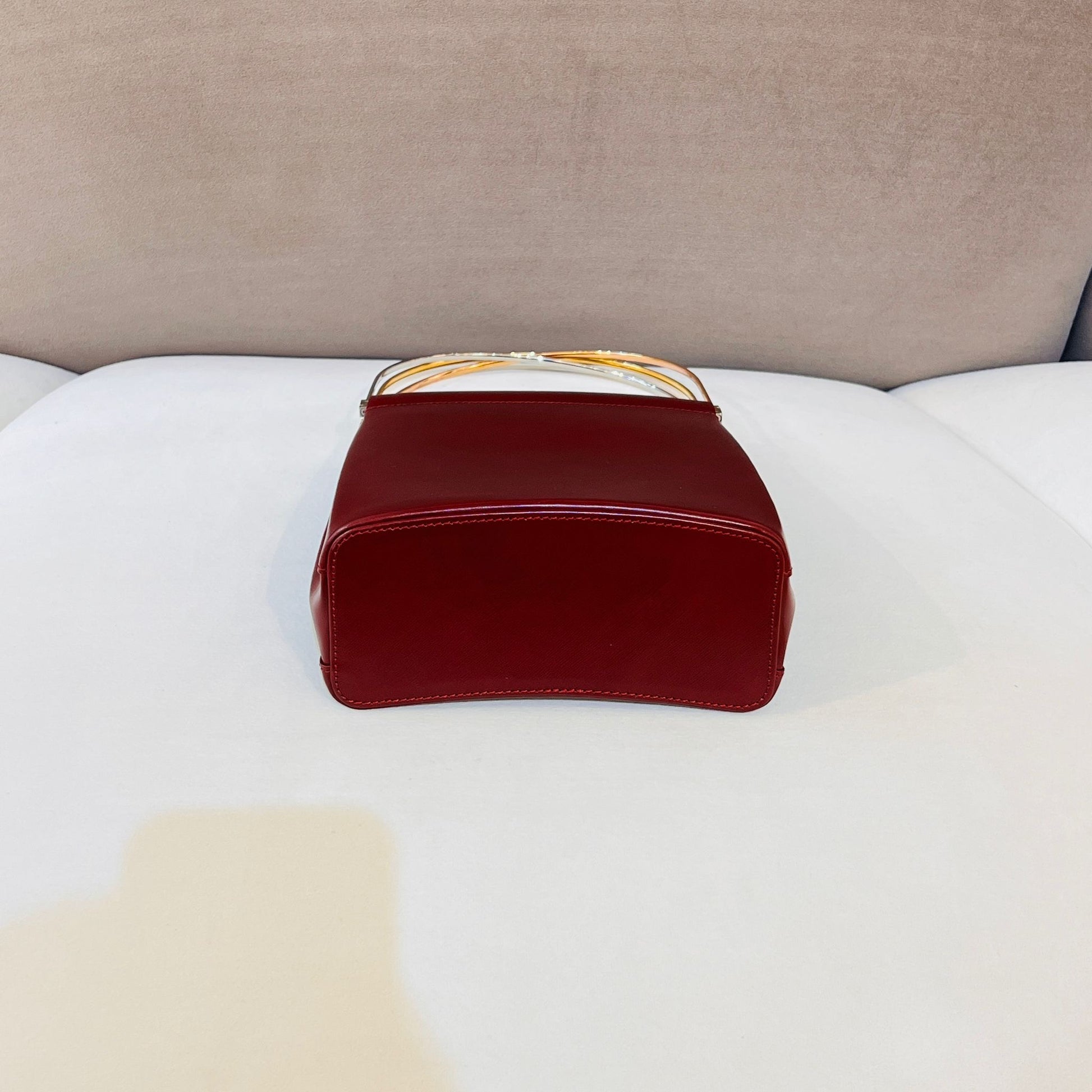 這款 Cartier Trinity 手袋以順滑波爾多紅皮革製成,重現 1980 年代巴黎奢華風格。標誌性的三環金屬手柄靈感源自品牌經典 Trinity 戒指,象徵愛、忠誠與友情,兼具設計感與意義。