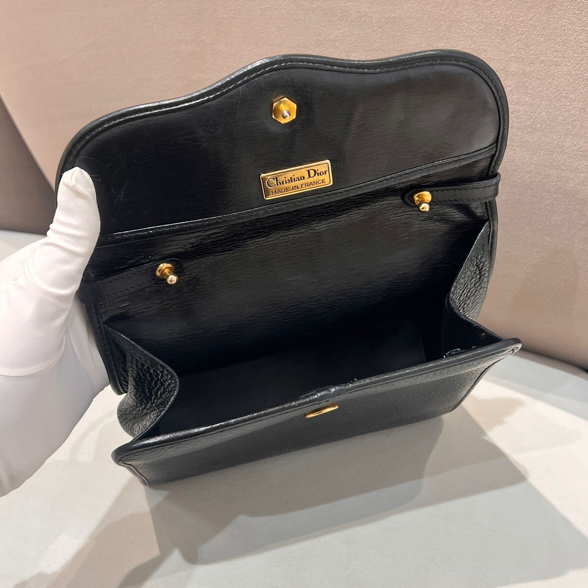 此款 Christian Dior 中古手挽袋以粒面黑色皮革製成,搭配結構分明的袋型與橢圓 Dior 標誌扣飾,體現 1970 至 1980 年代初期 Dior 對優雅比例與皮革工藝的講究。