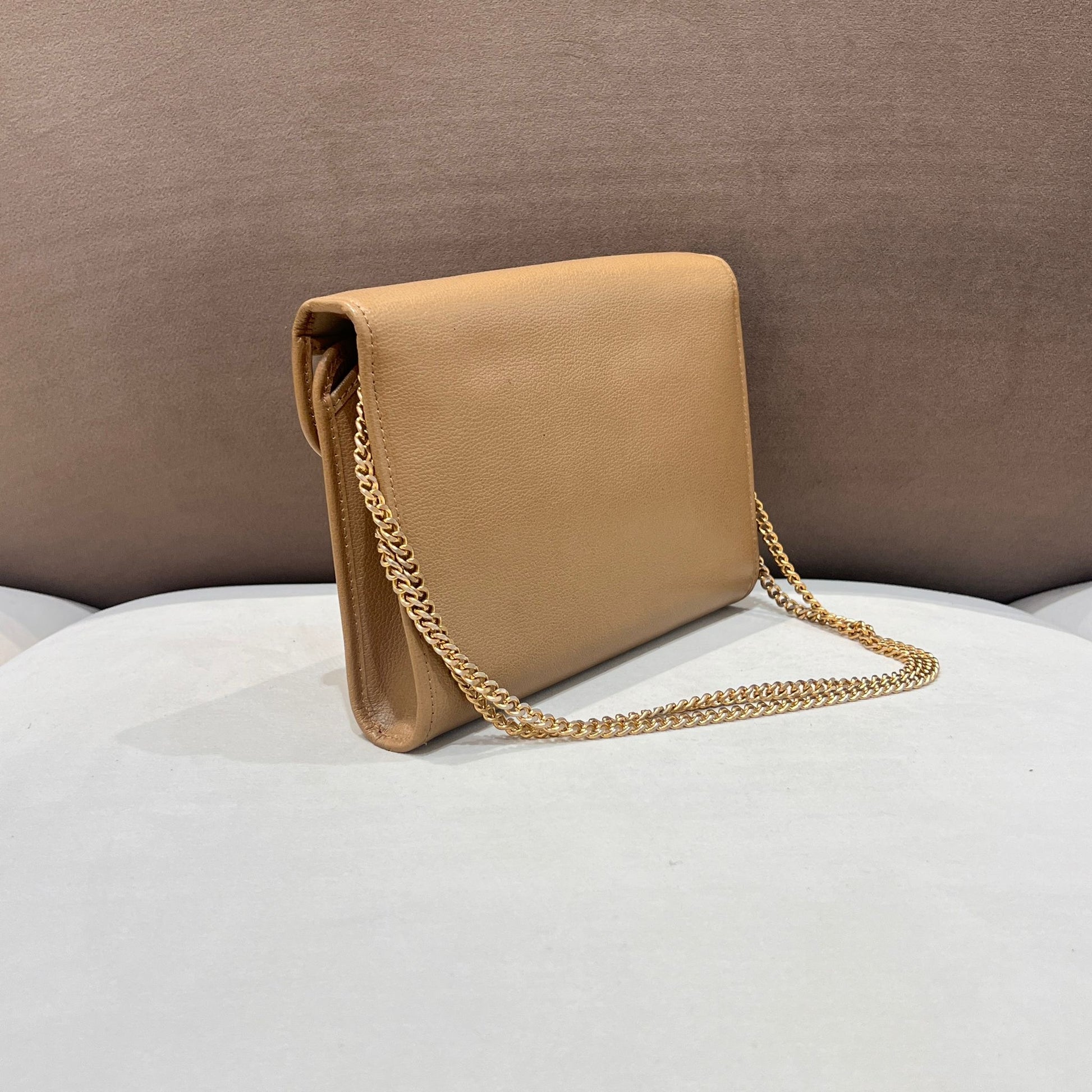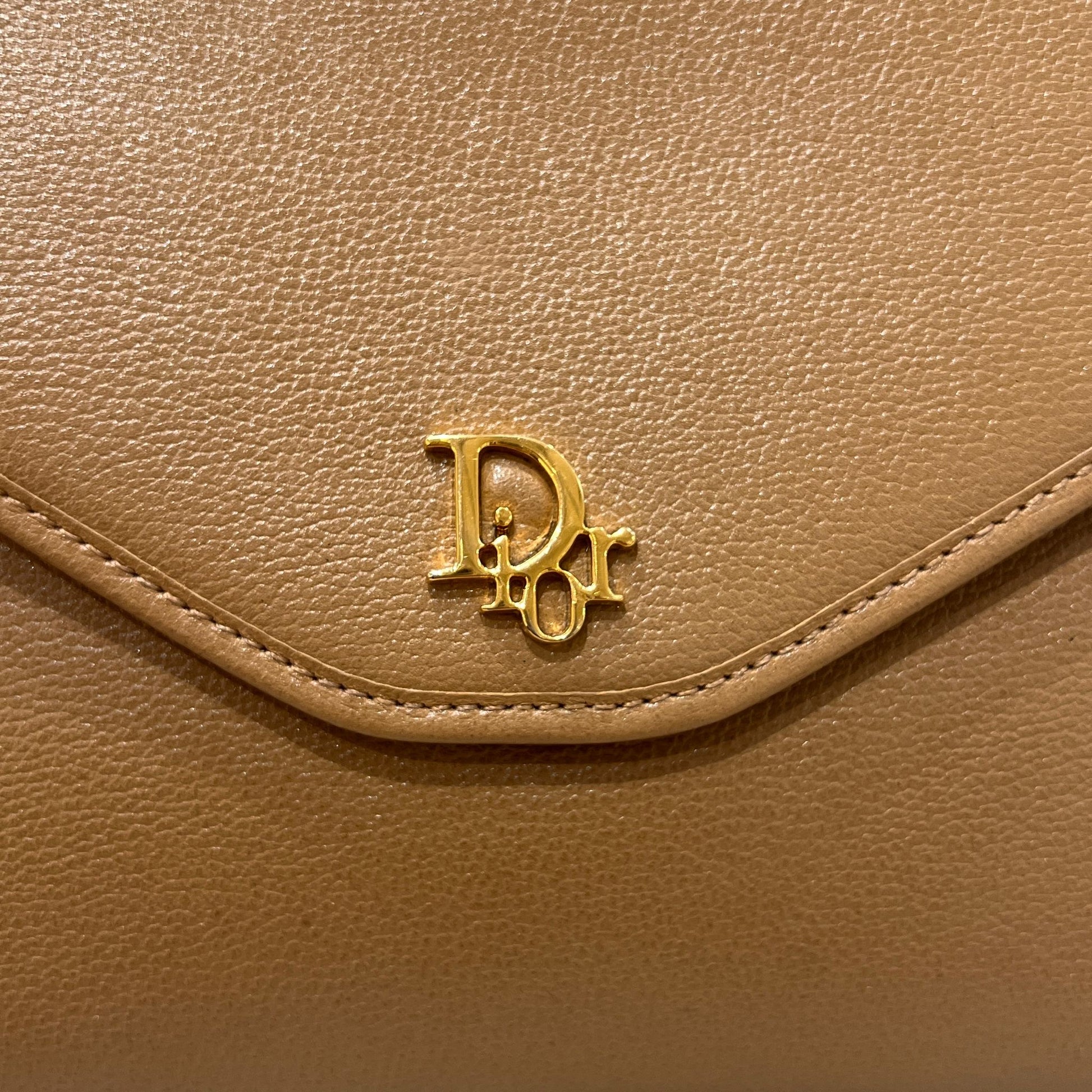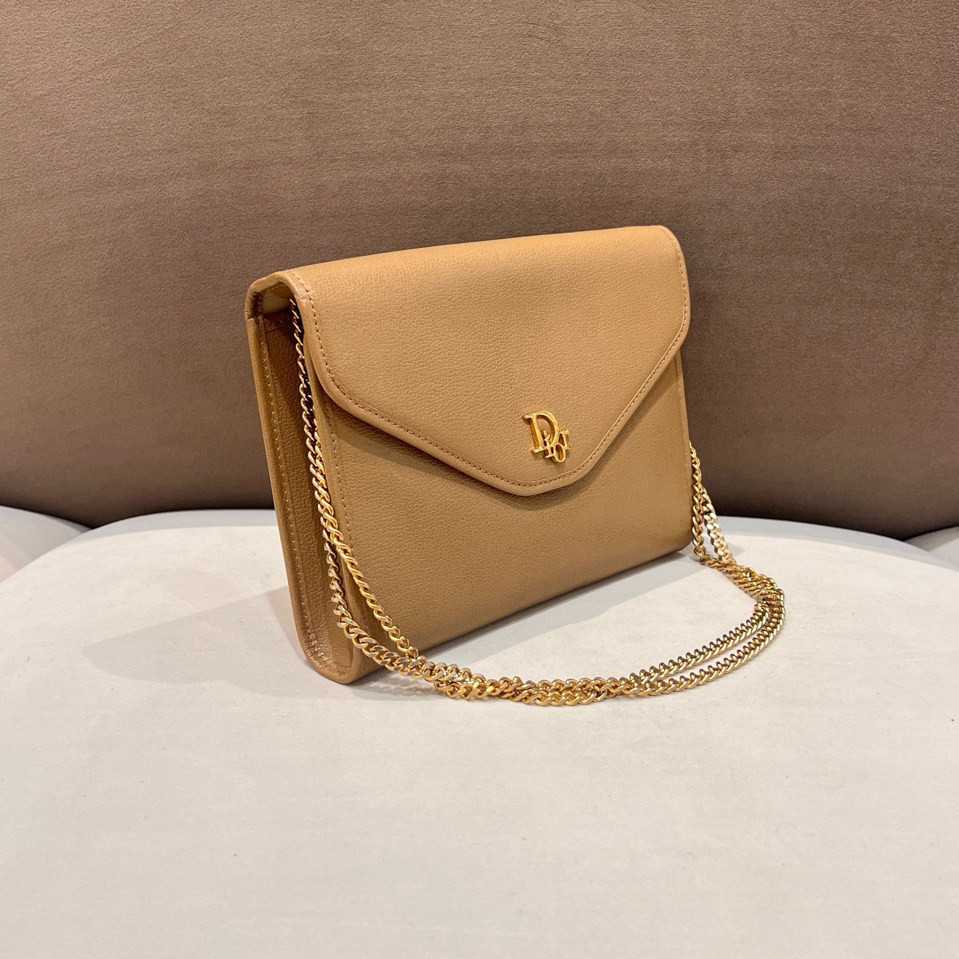 此款 Christian Dior 中古鏈帶肩背袋採用柔和米啡色粒面皮革製成,信封式翻蓋結合 Dior 字母標誌金屬扣,展現 1980 年代末至 1990 年代初 Dior 一貫的優雅袋款美學。