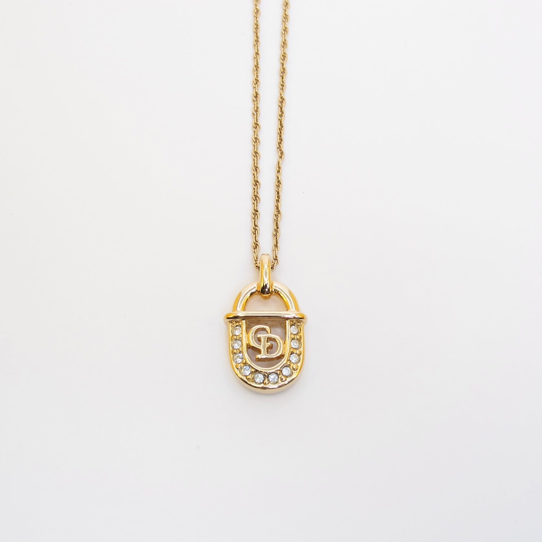 Christian Dior Vintage CD Logo in Padlock with Rhinestone Golden Necklace
