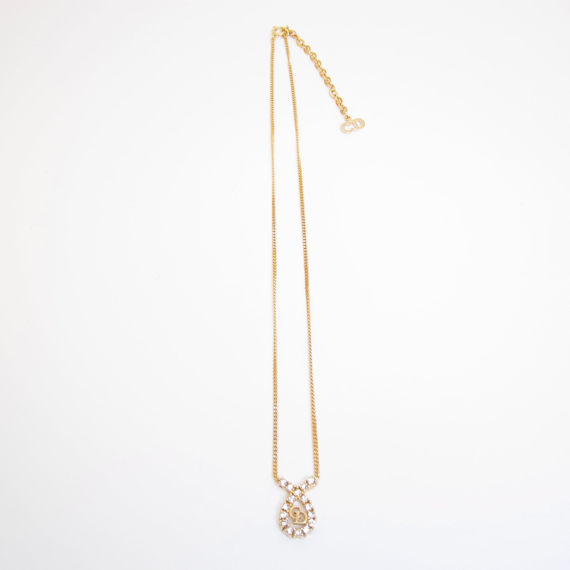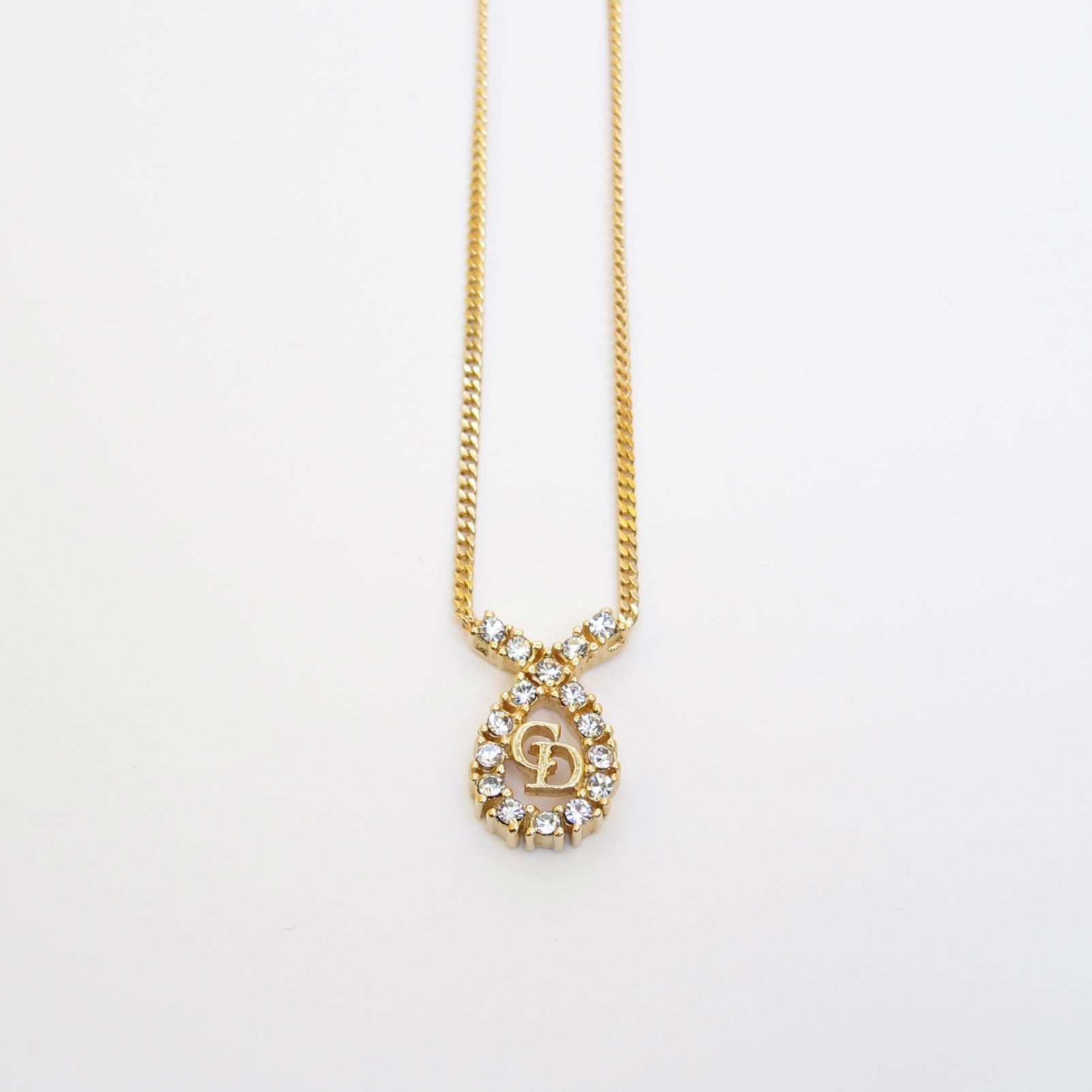 Christian Dior Vintage CD Logo in Drop Shape with Rhinestone Golden Necklace