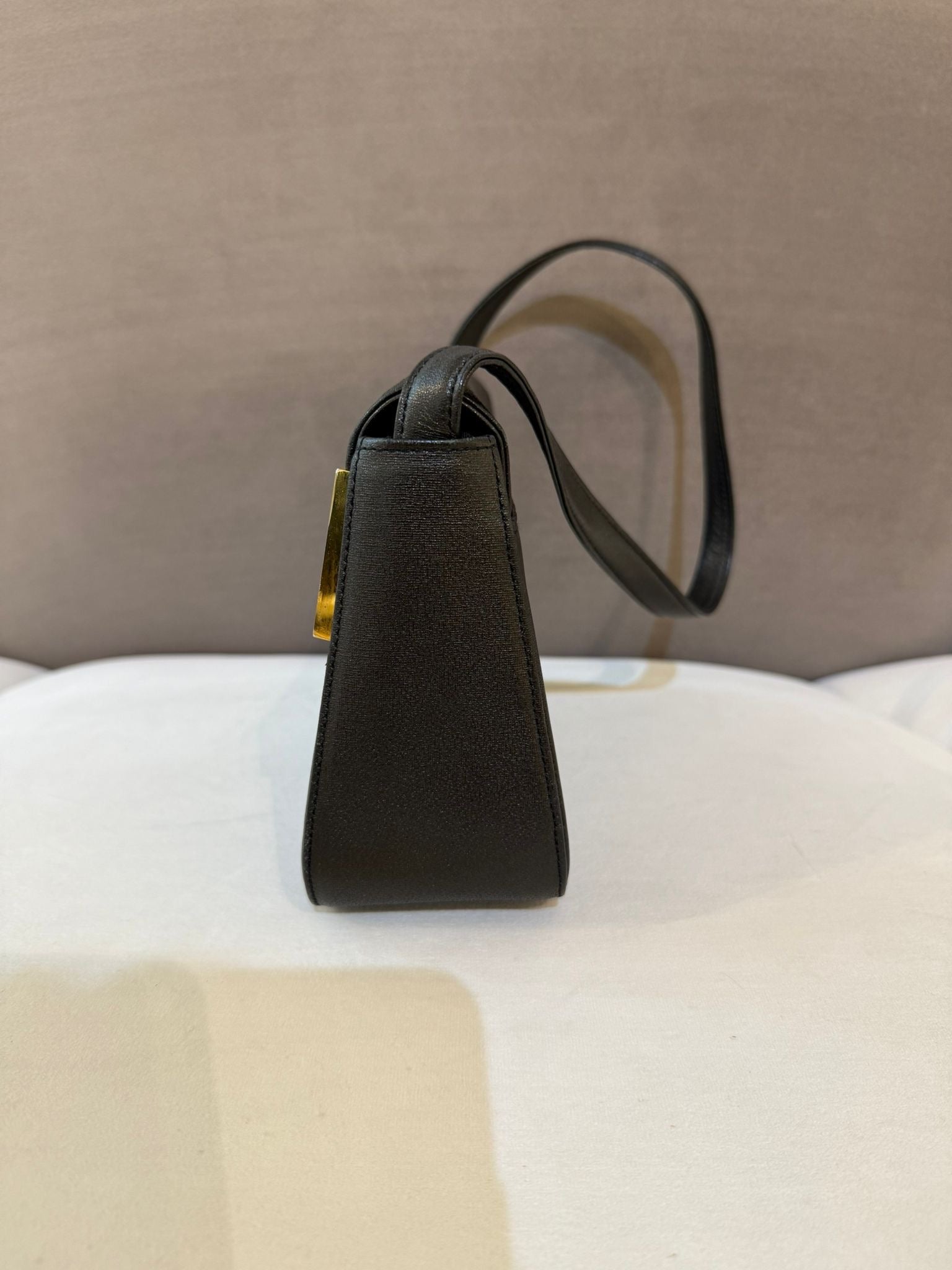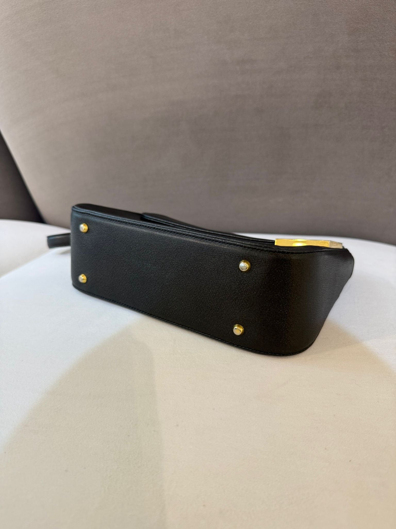 This vintage Givenchy bag features sleek black leather paired with the maison’s signature gold square logo plaque, exuding refined Parisian chic. Its structured silhouette highlights timeless design while maintaining everyday practicality.