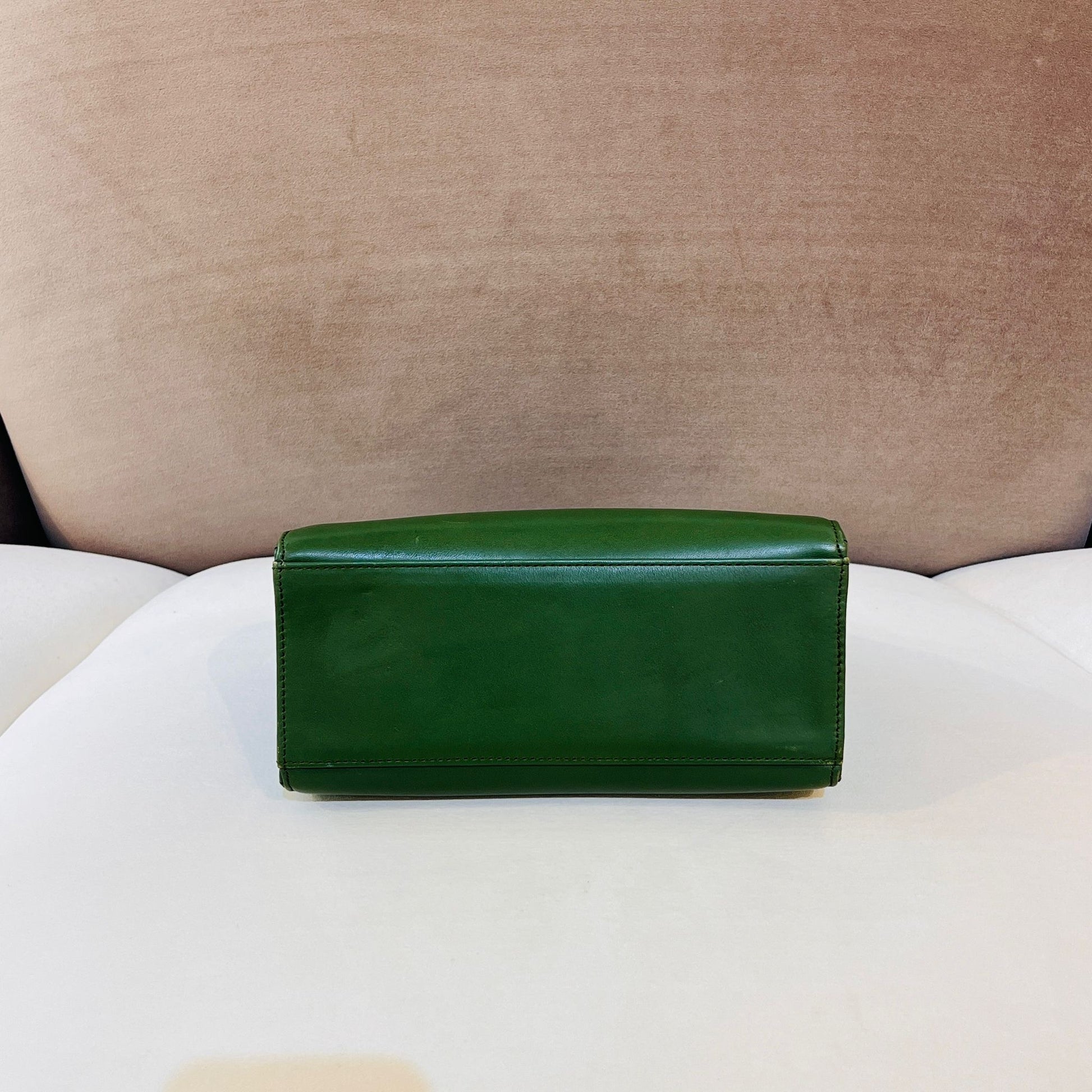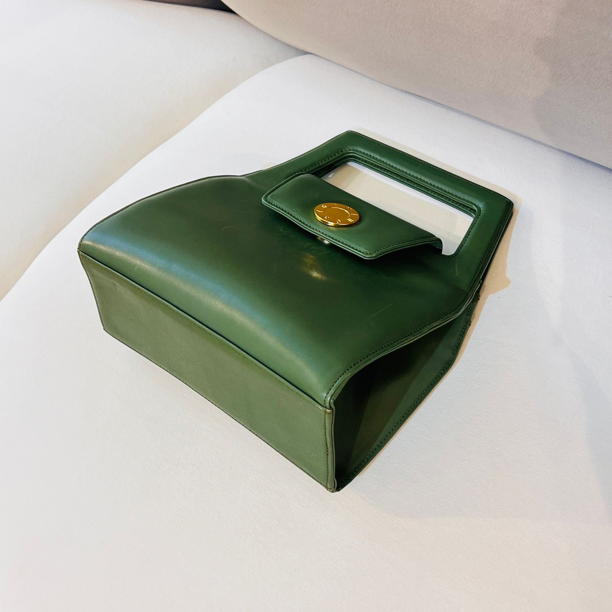 This rare Givenchy vintage piece is a statement of modern geometry and refined elegance. Crafted in deep forest green leather with a sculptural silhouette, it’s adorned with a signature gold medallion clasp that symbolizes understated Parisian prestige.