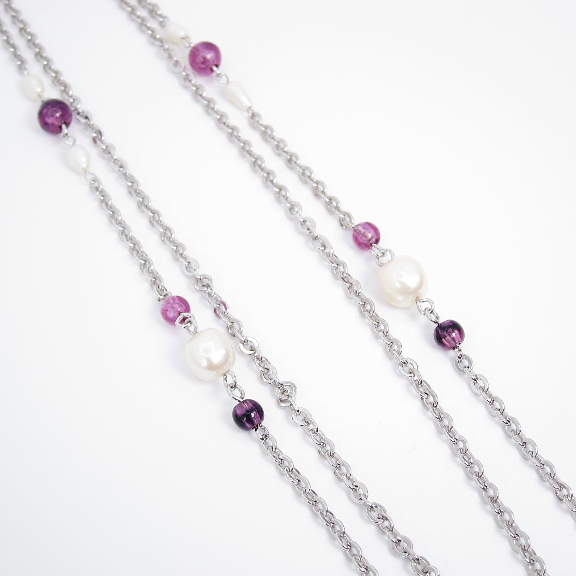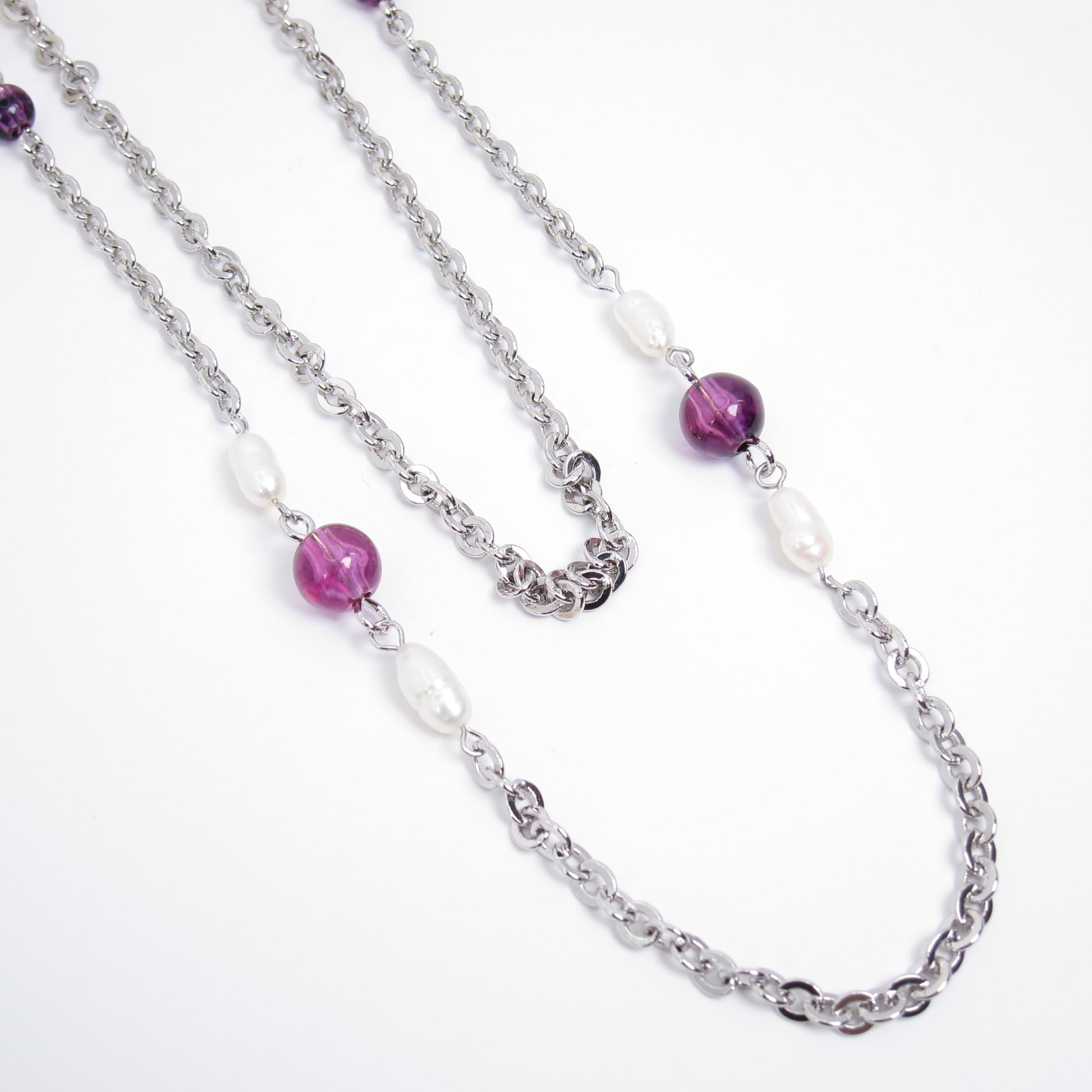 Pearl and Purple Bead Silver Long Necklace