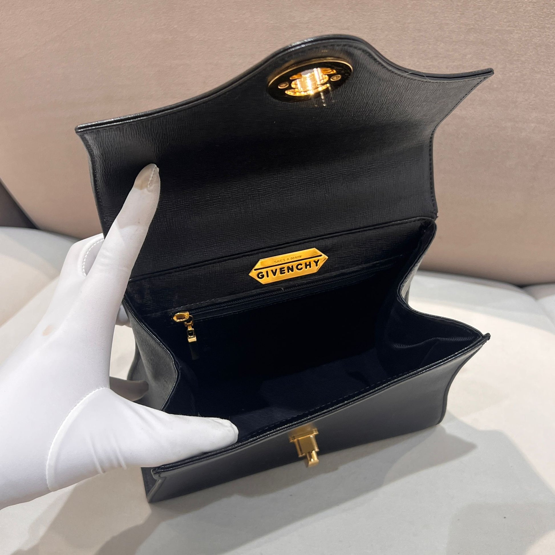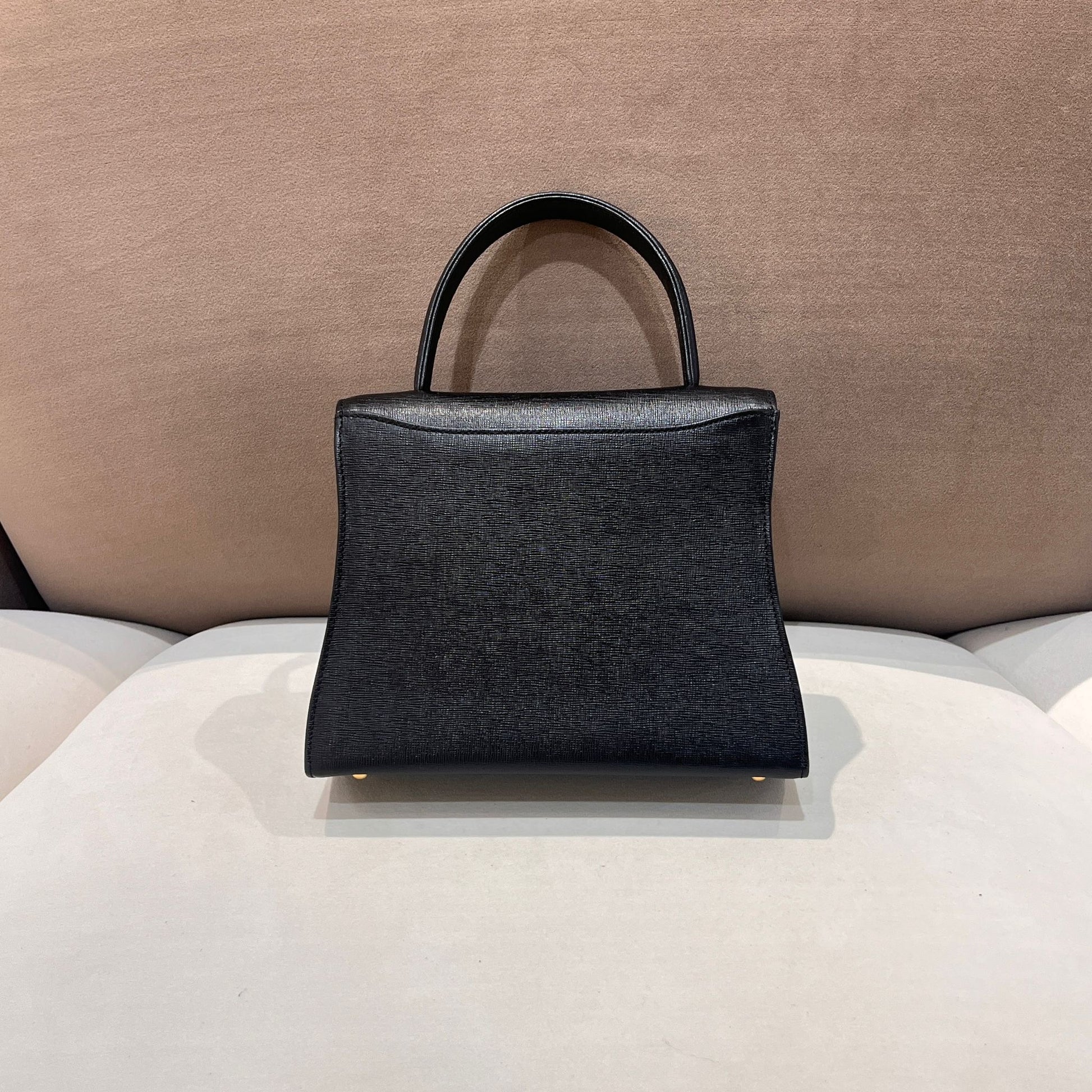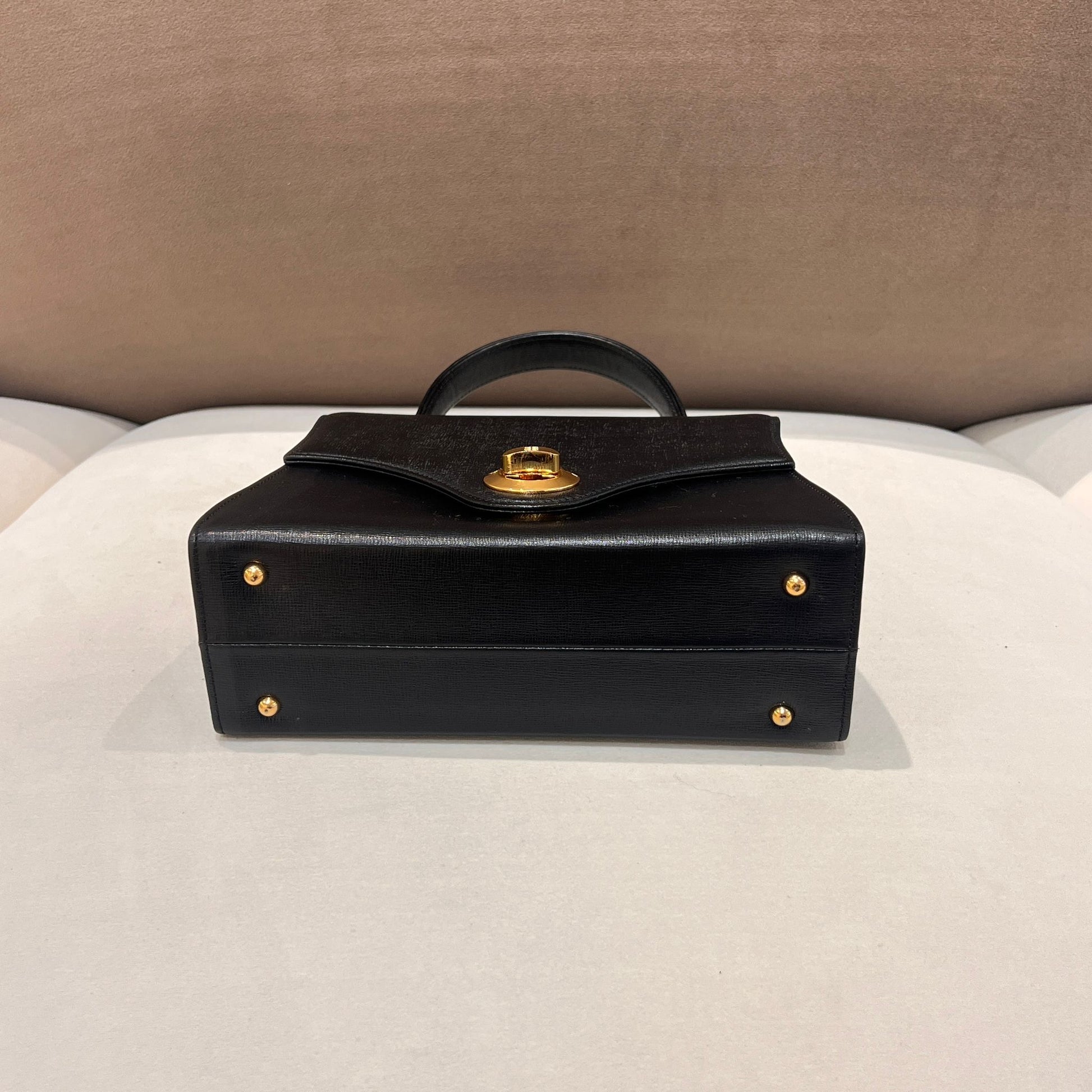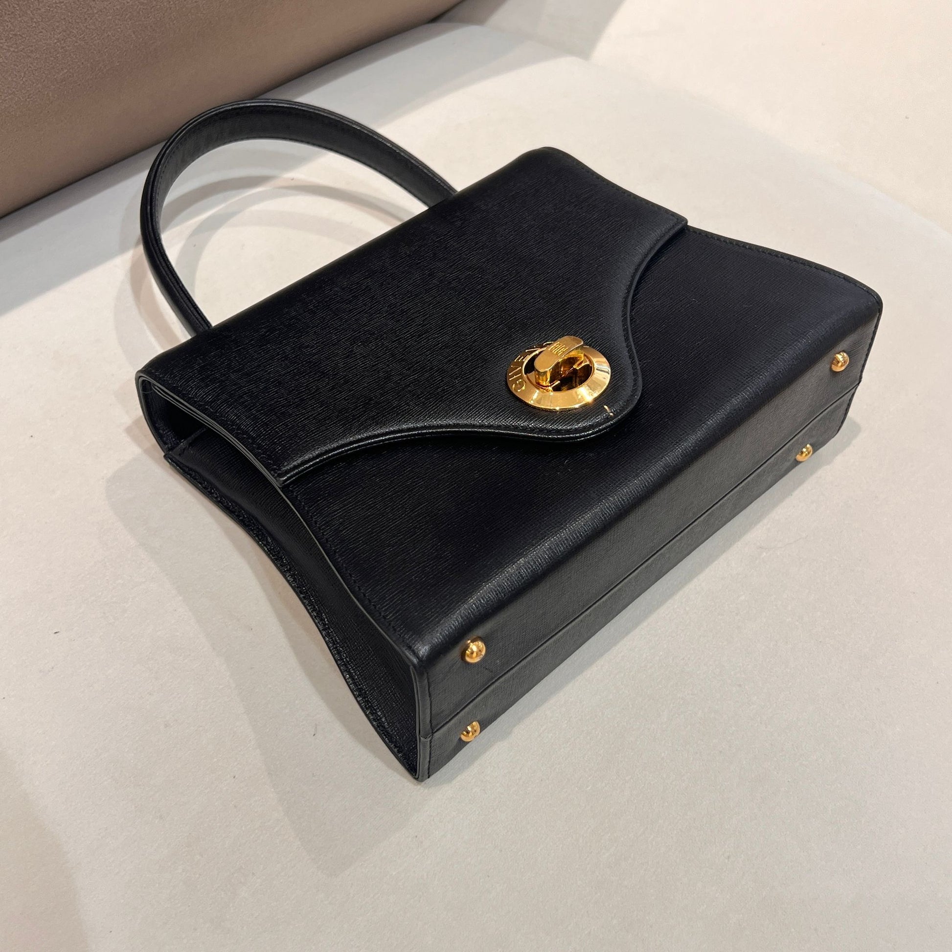 此款 Givenchy 中古手挽袋以挺身黑色皮革製成,配以經典金色 Turn-Lock 扣飾,完整呈現 1980 年代末至 1990 年代初 Givenchy 偏正式的設計語言。