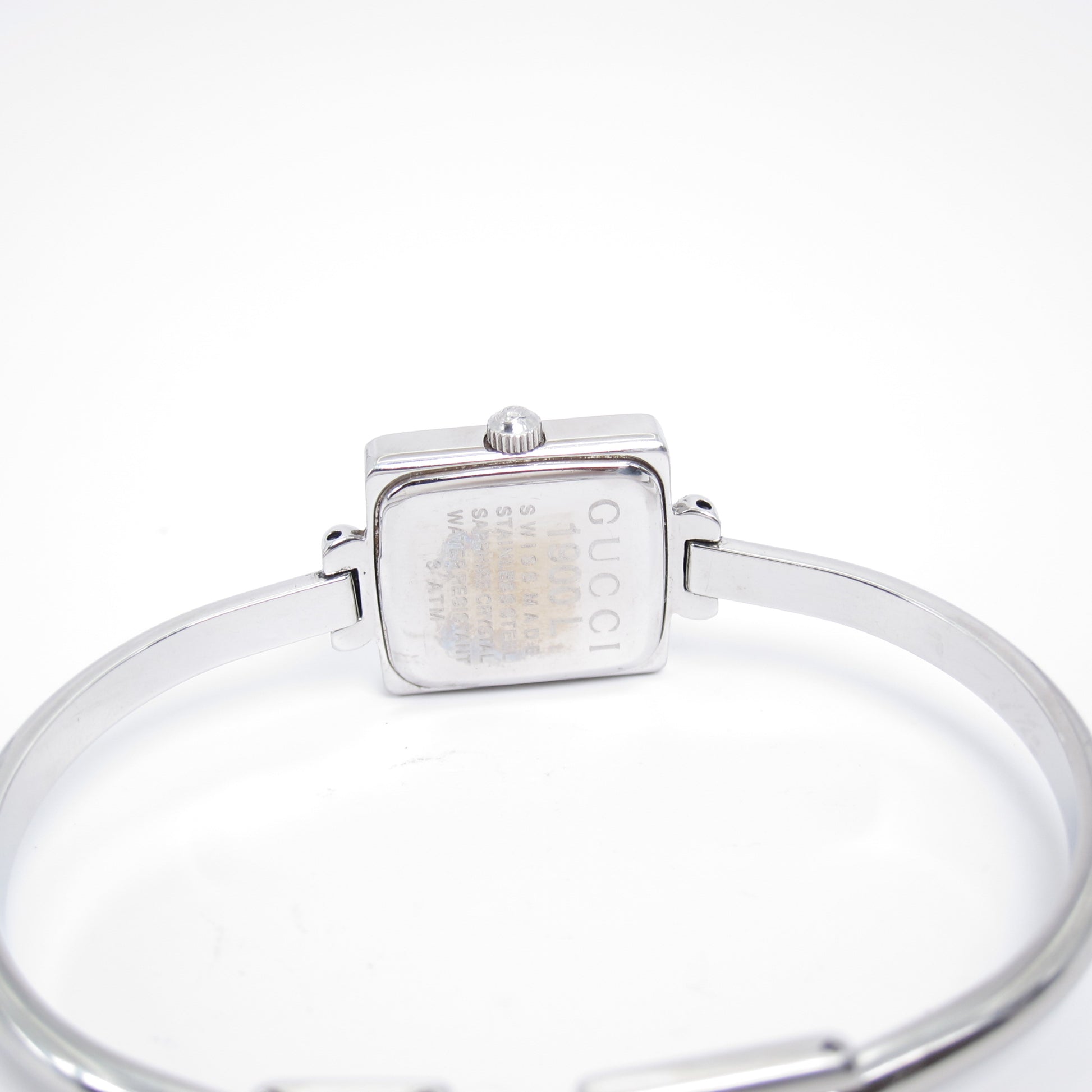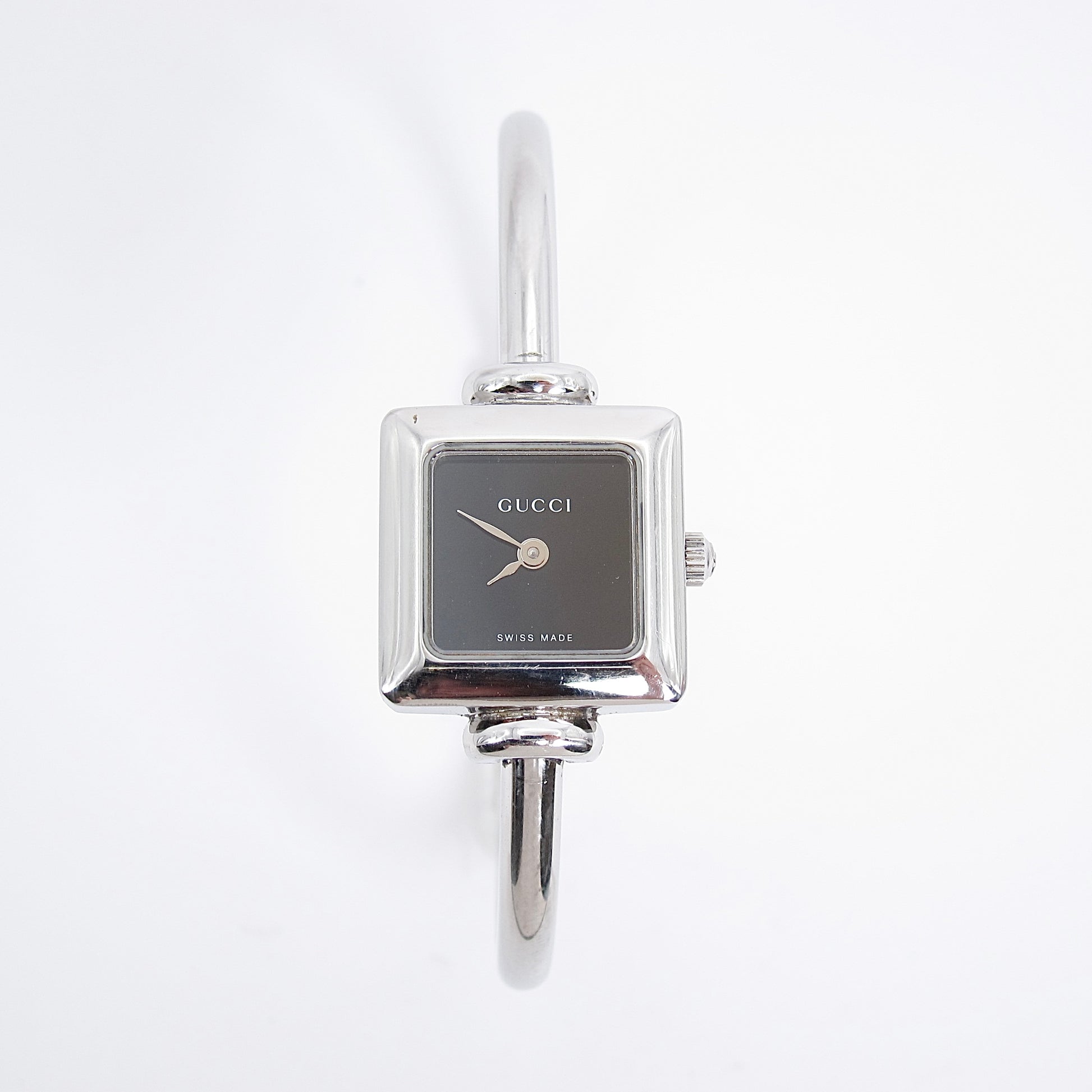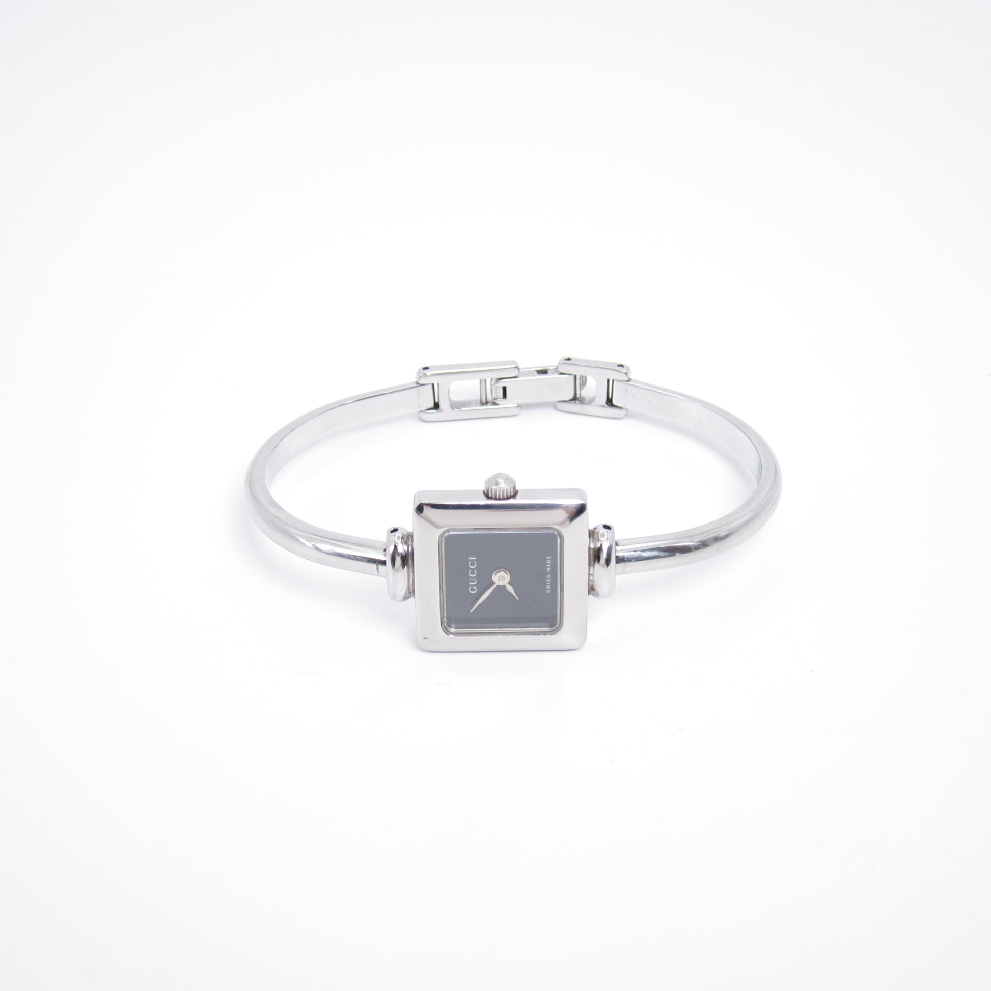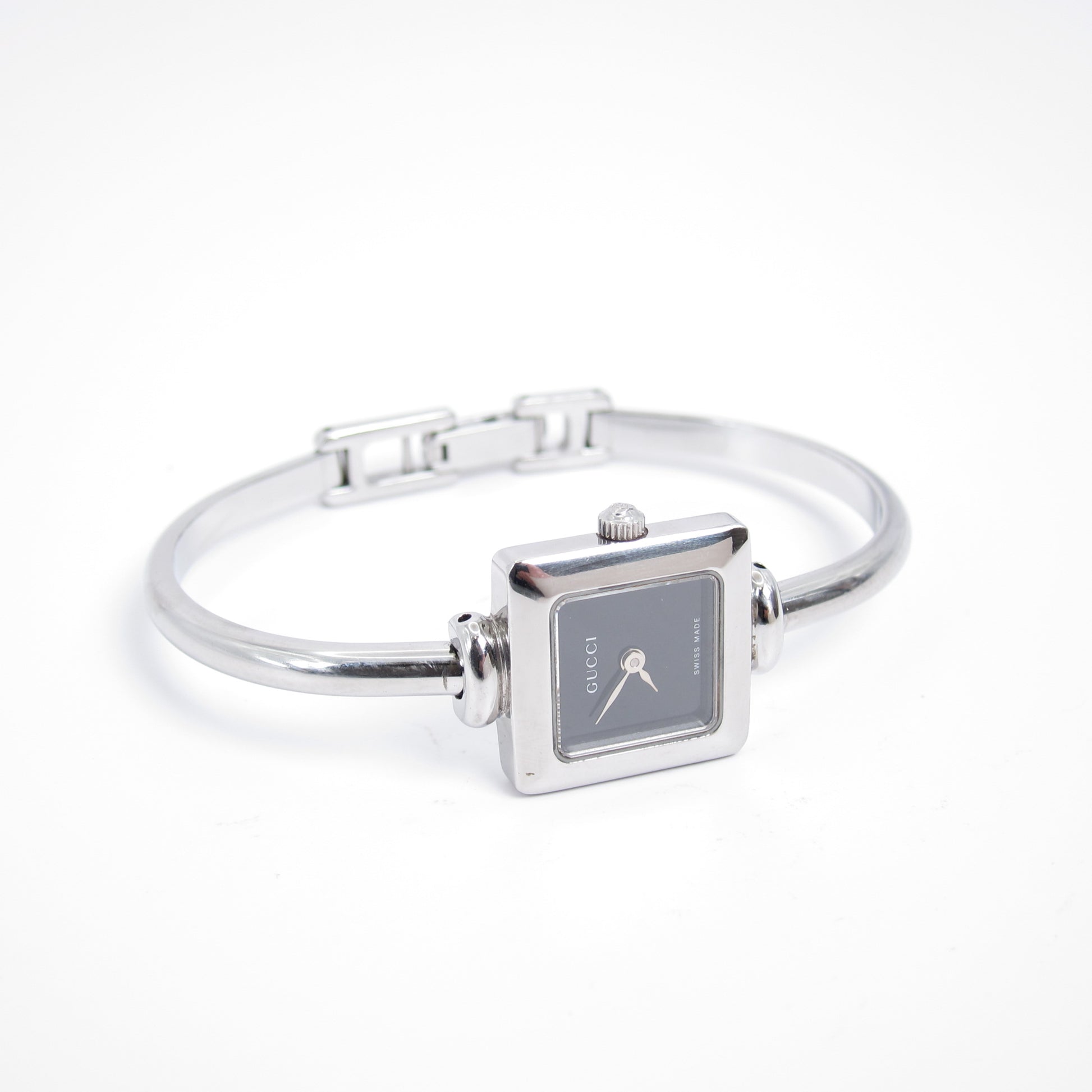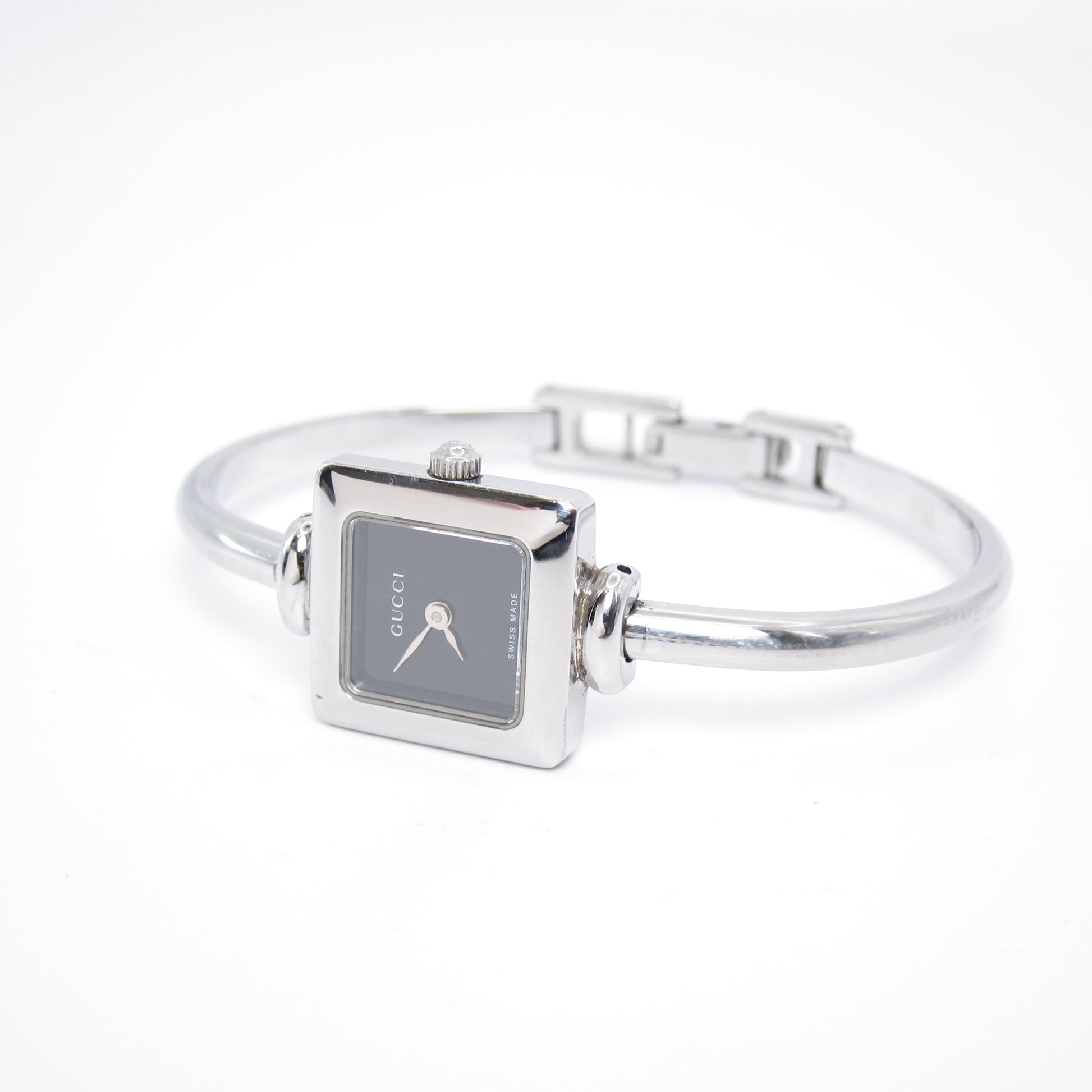 Gucci 復古方形黑色錶盤銀色手鐲腕錶