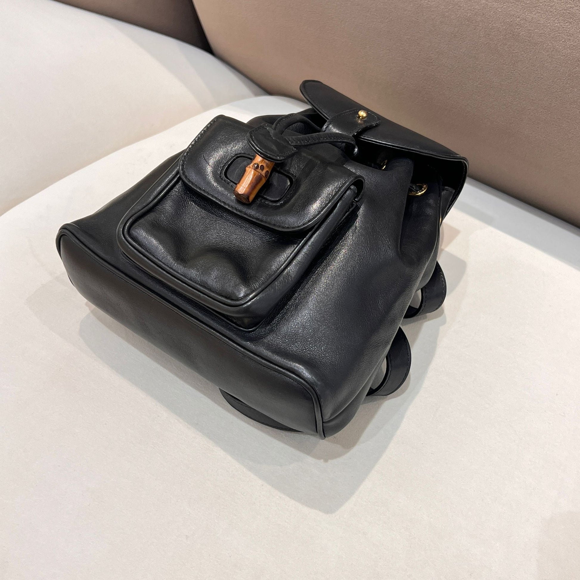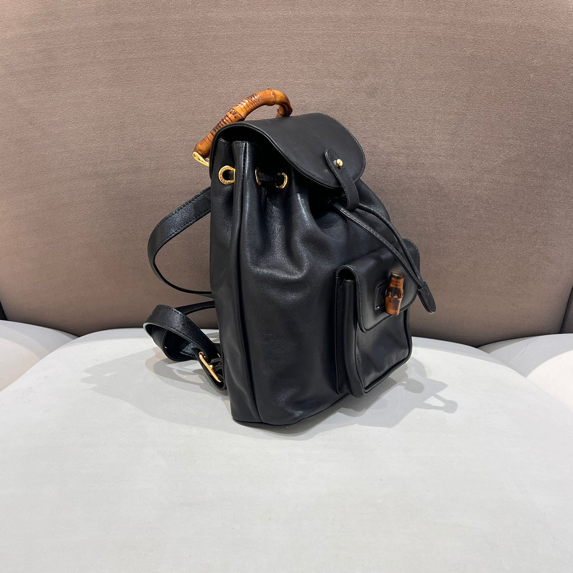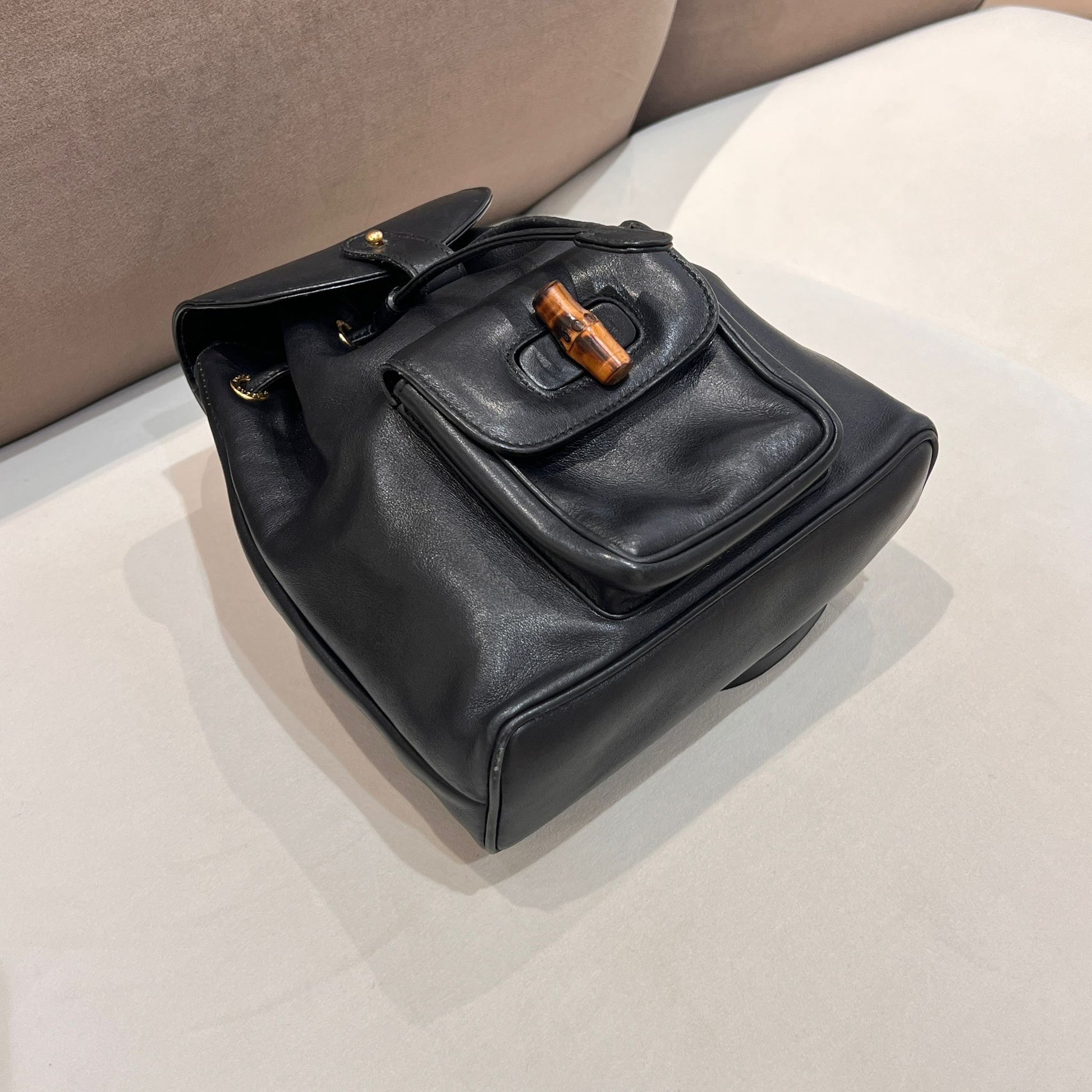 Gucci標誌性竹節手柄,呈現出最具品牌代表性的經典元素黑色皮革袋身,呈現柔中帶挺的復古背包,前置翻蓋口袋配竹扣設計,兼具實用與特色抽繩加翻蓋結構,適合日常使用且安全性極高價值的Gucci Bamboo經典中古背包