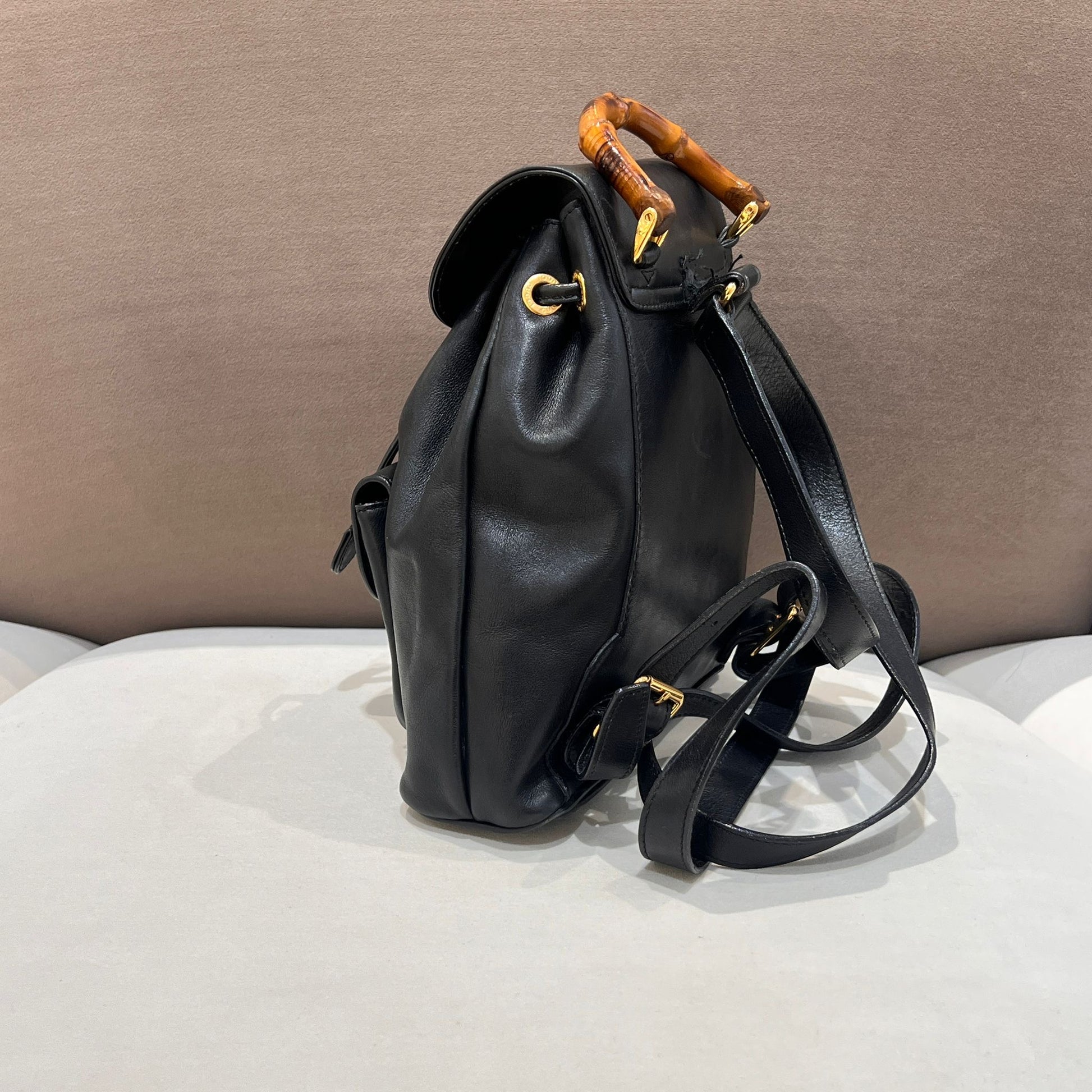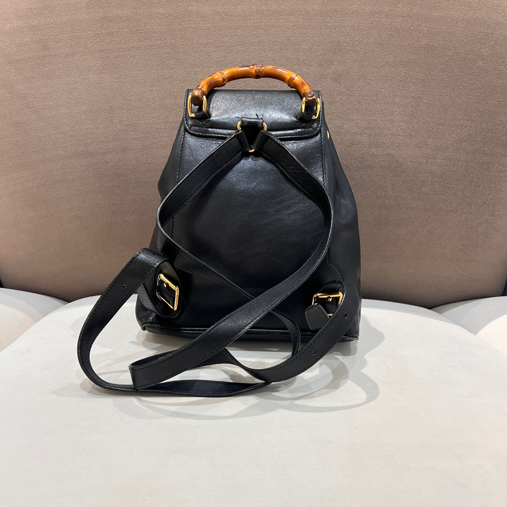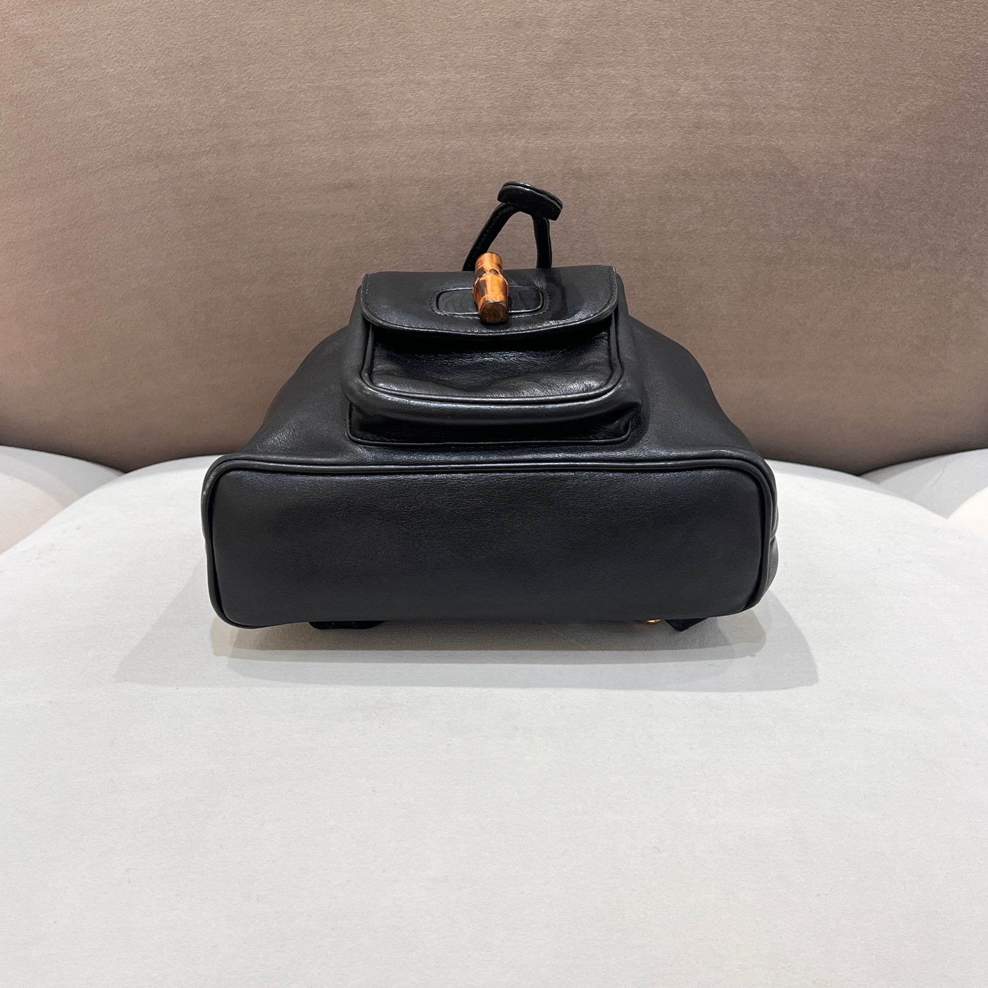Gucci標誌性竹節手柄,呈現出最具品牌代表性的經典元素黑色皮革袋身,呈現柔中帶挺的復古背包,前置翻蓋口袋配竹扣設計,兼具實用與特色抽繩加翻蓋結構,適合日常使用且安全性極高價值的Gucci Bamboo經典中古背包
