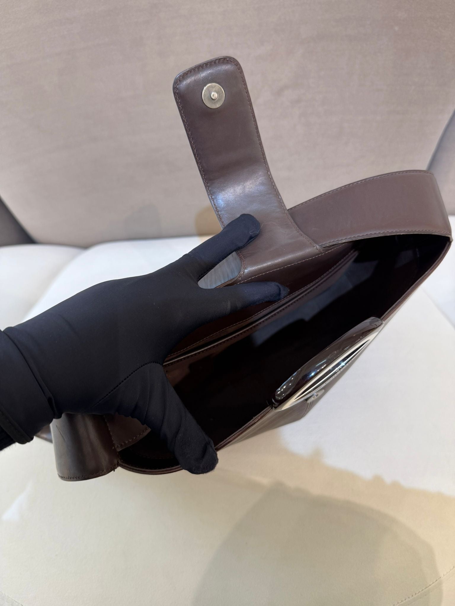 The Louis Vuitton Revi bag in mocha Epi leather is a rare gem, showcasing the maison’s signature textured leather in an elegant warm brown hue. Its sleek silhouette is complemented by a unique top buckle closure, making it both functional and collectible.
