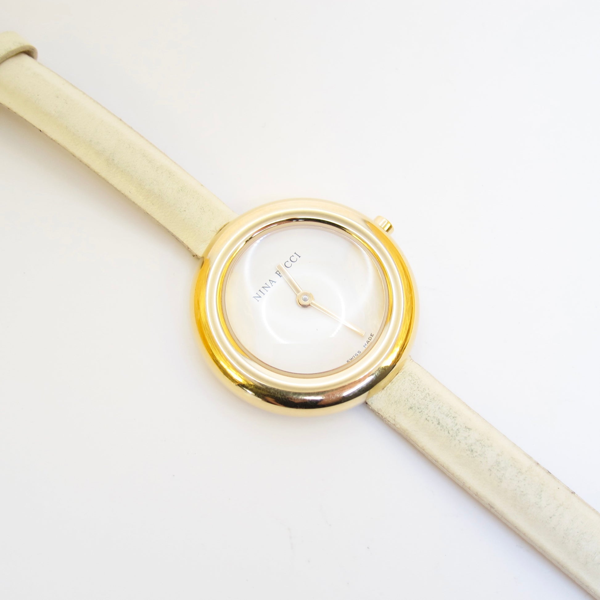 Nina Ricci Vintage Round White Face Golden Watch with Ivory Leather Strap