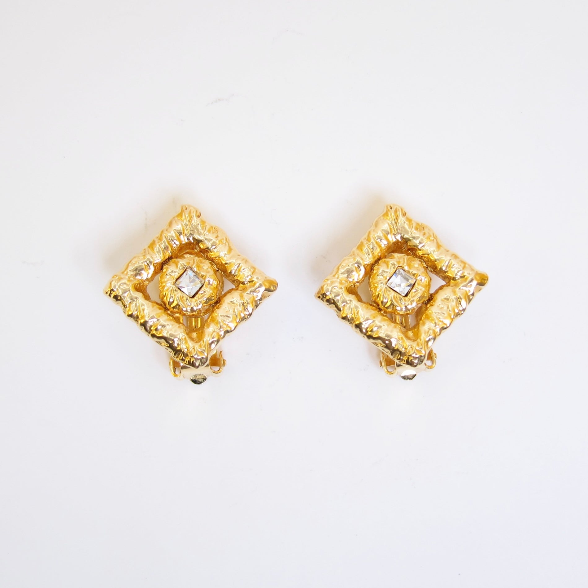 Yves Saint Laurent Vintage Rhombus with Rhinestone Golden Clip-on Earrings